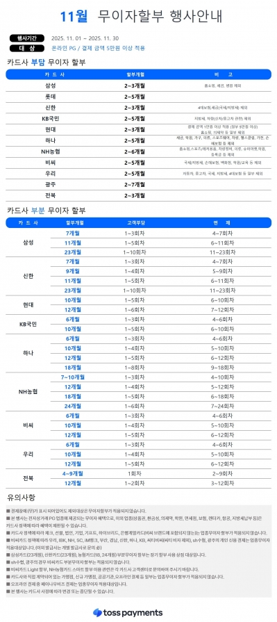 11월 카드 무이자 할부 안내