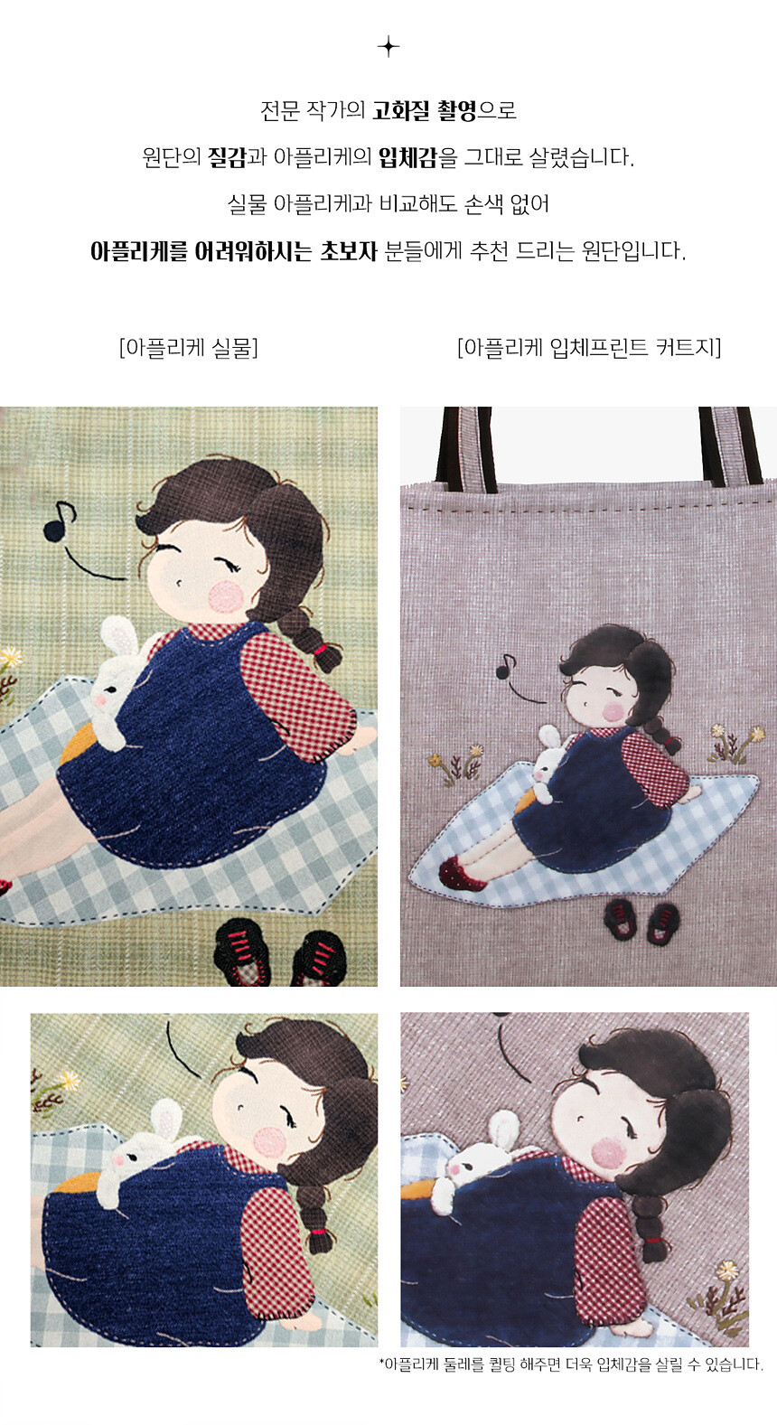 작품을 만들 수 있습니다. 벽걸이,소품,가방,이불 등 완제품 활용도가 아주 높은 원단입니다.